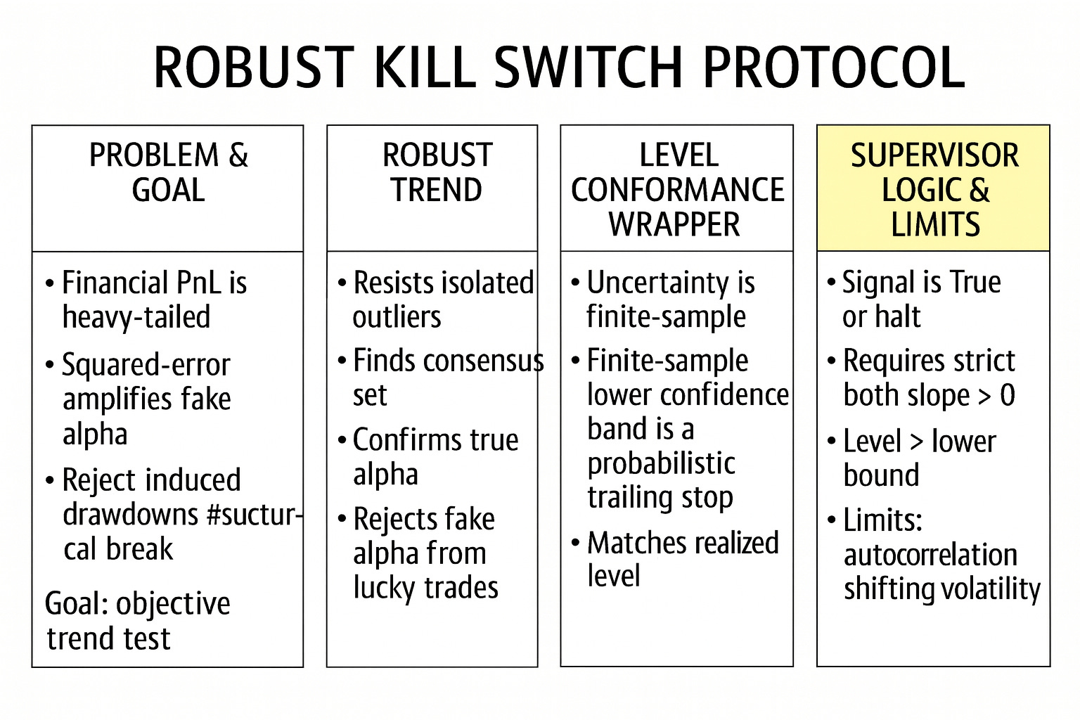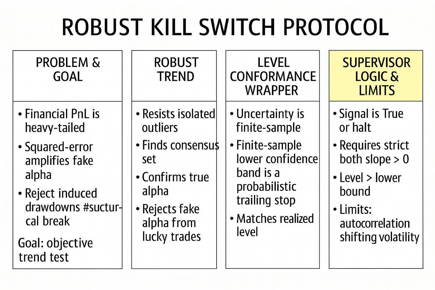 This is the trend validation trap: we want a kill-switch that enforces a strict positivity constraint on performance, because capital should not sit inside a system that is not demonstrably compounding. Yet the standard method used to measure trend is built on squared-error minimization, which amplifies precisely the observations we should distrust most. The consequence is a conflict between operational necessity and statistical fragility. If we keep the rule but rely on OLS, we risk zombie strategies surviving on the back of one exceptional trade, and healthy strategies getting shut down due to a transient tail event or a bad print. If we abandon the rule, we drift back into discretionary tolerance bands and post-hoc rationalizations—exactly the failure mode a kill-switch is meant to prevent.