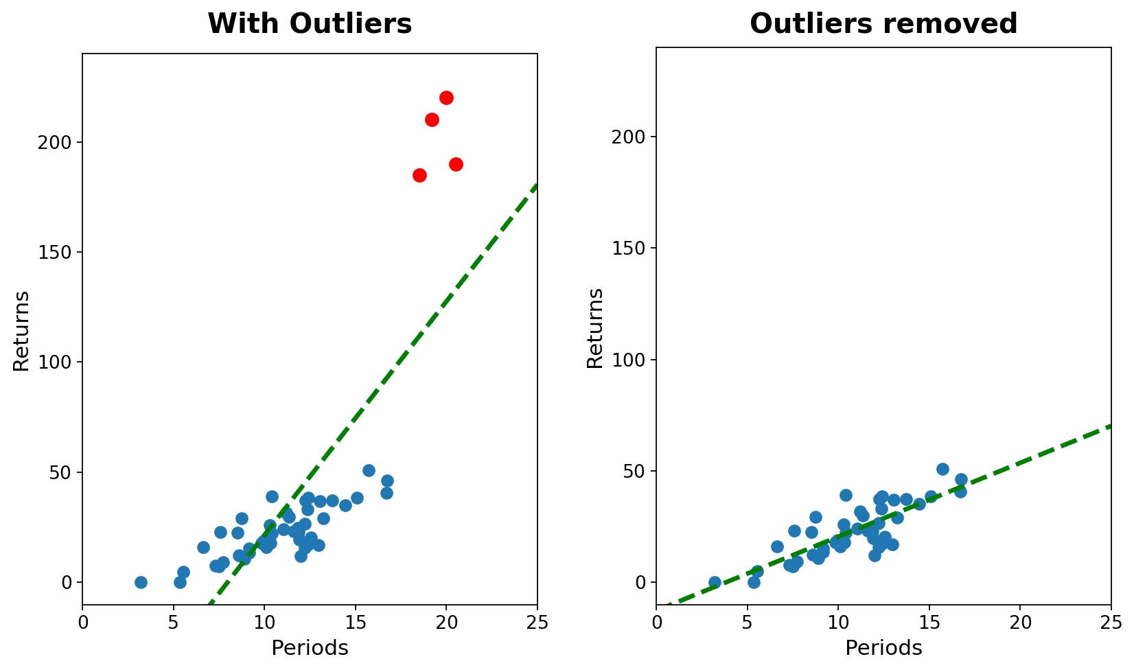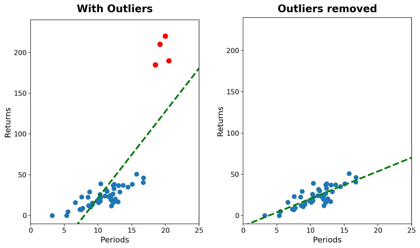 Consider a strategy that has structurally lost its edge. The true drift β is negative; it is slowly bleeding capital. However, during a market dislocation, the strategy executes a trade into a liquidity vacuum or benefits from a data error, recording a massive, phantom profit (a positive outlier).The OLS reaction: The regression line, anchored by this positive outlier, tilts aggressively upward. The calculated slope flips from negative to positive.