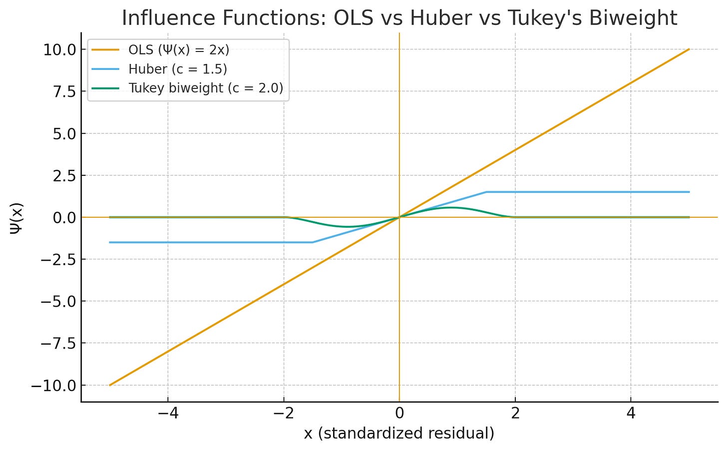The influence of an error grows linearly with its magnitude. A 10σ event has 10 times the pull of a 1σ event. This is unacceptable for fat-tailed markets.