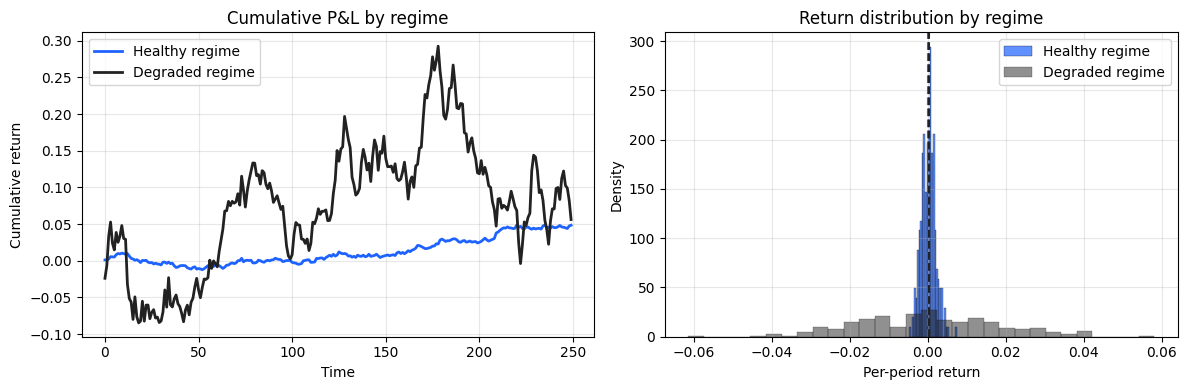 Degraded regime: Zero or negative expectancy, often accompanied by volatility clustering where variance spikes due to liquidity constraints, crowding, or breakdown in the correlation structure.