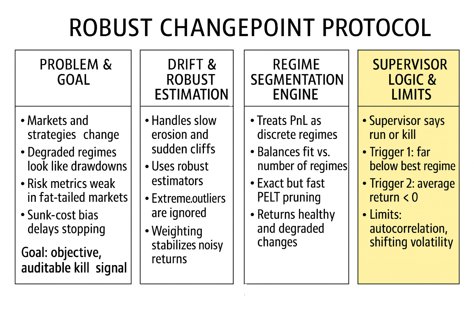 Look at it from the supervisor’s perspective. You observe a noisy sequence of PnL: good days, bad days, occasional 5–10σ events courtesy of fat tails and slippage. Somewhere inside that, the expected value of the strategy can jump from strongly positive to mildly positive, from mildly positive to mediocrity, or from mediocrity to outright negative. Your job is to distinguish those regime changes from random turbulence—fast enough to avoid ruin, slow enough to avoid killing healthy engines.