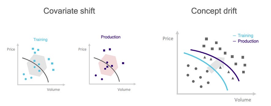 Concept drift occurs when the relationship between the signal and the target changes, i.e., P(y|X) shifts. This is the most dangerous form of drift.